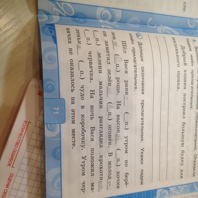 Шёл Вася ранним ( Т. п.) утром по берёзовой (Д.п) роще.На высокой ( И.п) кочке он заметил зеленый (В.п) огонёк.В молодой (П.п) зелени мальчик разглядел крохотного (В.п) червячка. На ночь Вася положилт маленькое (В.п.) чудо в коробочку.Утром червячка не оказалось на этом месте.