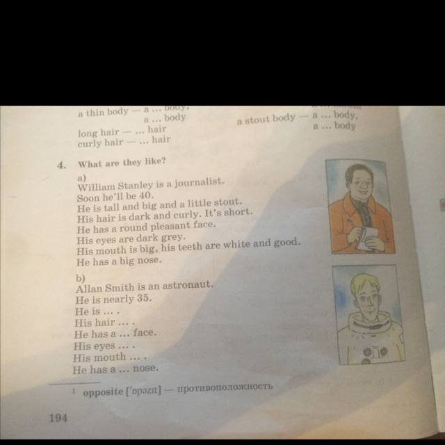 Allan Smith is a astronaut. He is nearly 35. He is tall and slim. His hair is blond and straight. It is short. He has an oval pretty face. His eyes are blue. His mouth is small. He has a long nose.