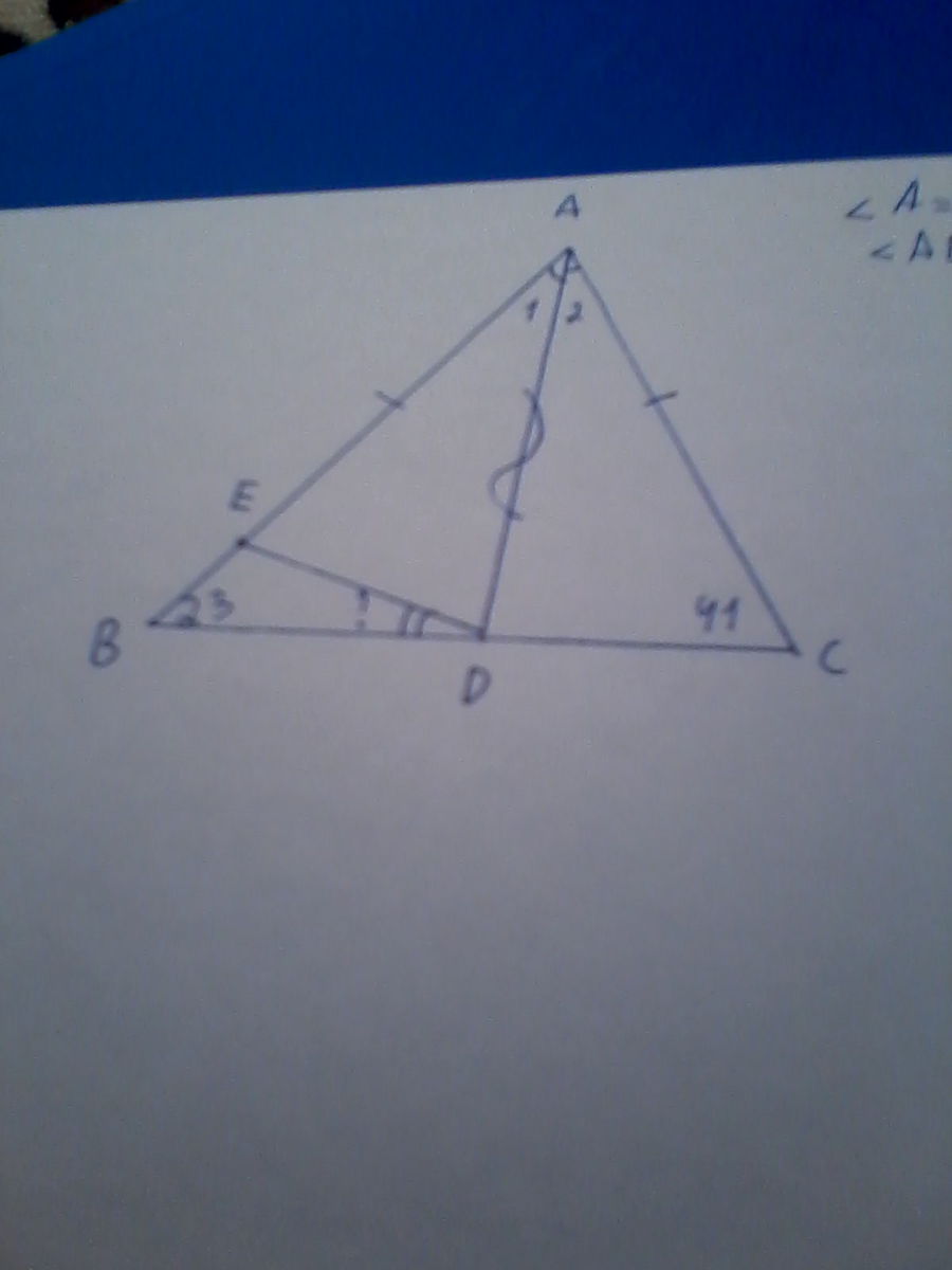 В треугольнике АВС угол В равен 23 градуса, угол С равен 41 градуса, АD - биссктриса, Е - точка на стороне АВ, такая, что АЕ=АС. Найдите угол ВDЕ. Ответ дайте в градусах.