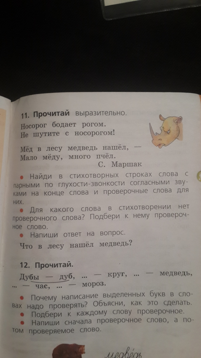 В самом стихе проверочными словами являются слова: носорогом, тут уже ясно слышно, что надо г писать. Мёду, тоже самое.