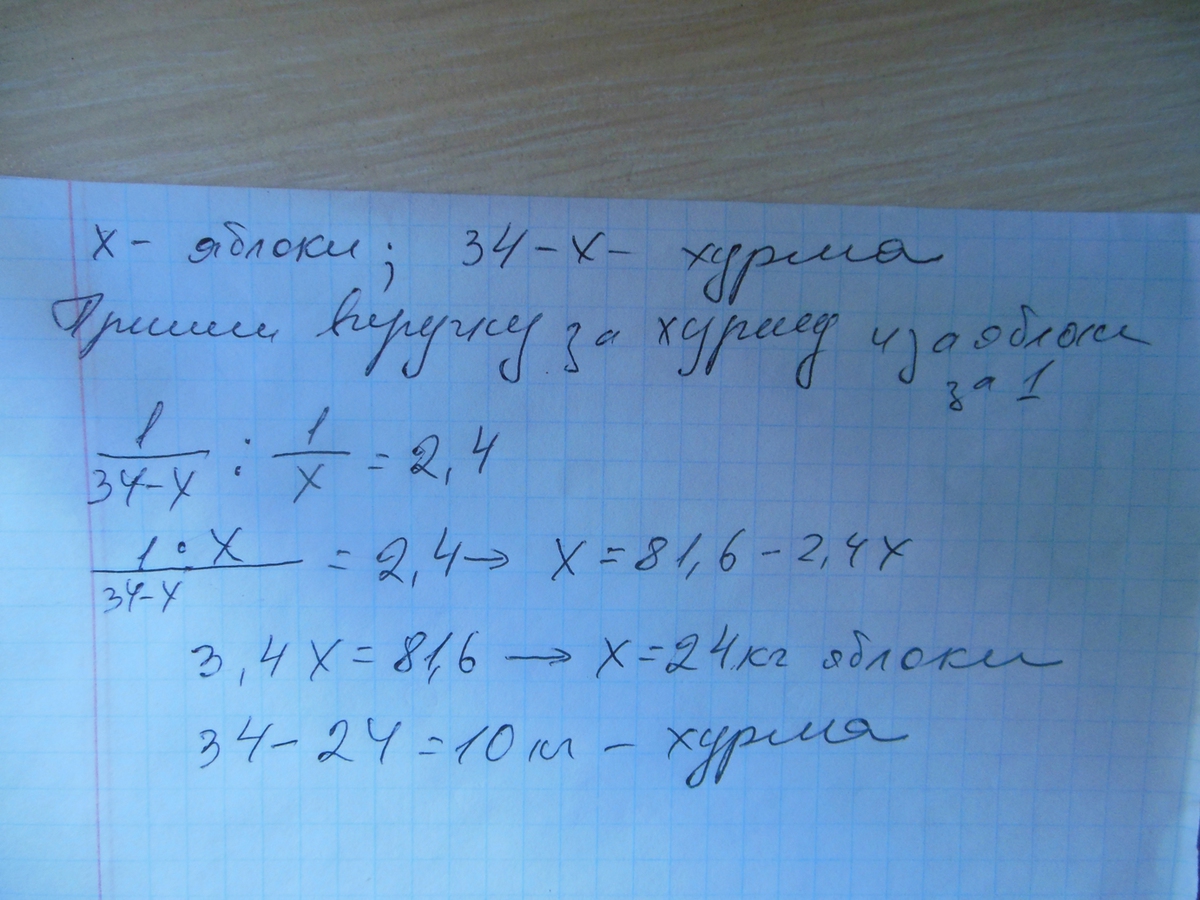 Продано 34 яблок и хурмы.Определите сколько продано яблок и сколько хурмы,если известно,что яблоки дороже хурмы в 2,4 раза и за все яблоки выручено столько же денег,сколько за хурму.