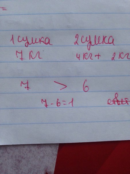 У папы в одной сумке арбуз массой 7 кг, а в другой-4 кг картофеля и 2 кг капусты. В какой сумке груз легче и на сколько килограммов?
