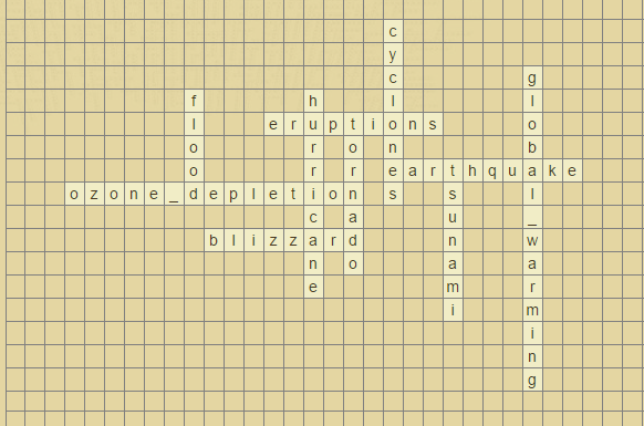 Вот полный список слов: blizzard cyclones earthquake eruptions flood global_warming (глобальное потепление) hurricane ozone_depletion (озоновое истощение - озоновые дыры) tornado tsunami