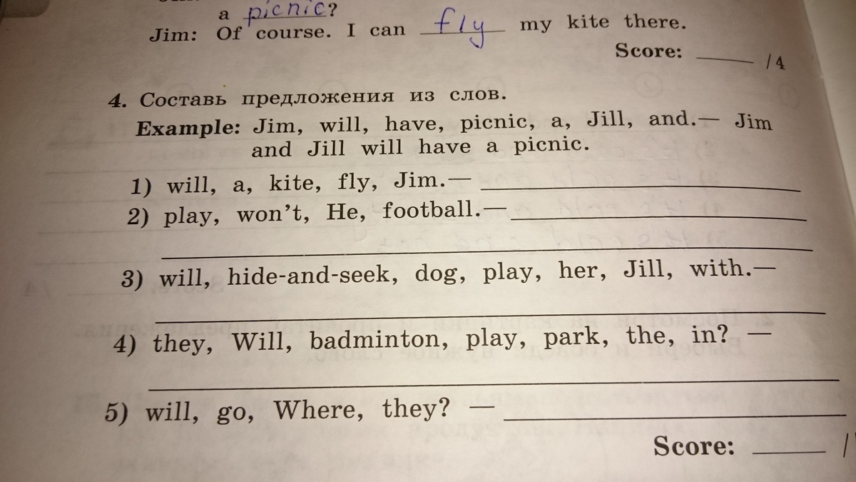 1.Jim will fly a kite.2)He won't play football.3)Jill will play hide-and-seek with her dog.4)Will thay play badminton in the park?5)Where will thay go?