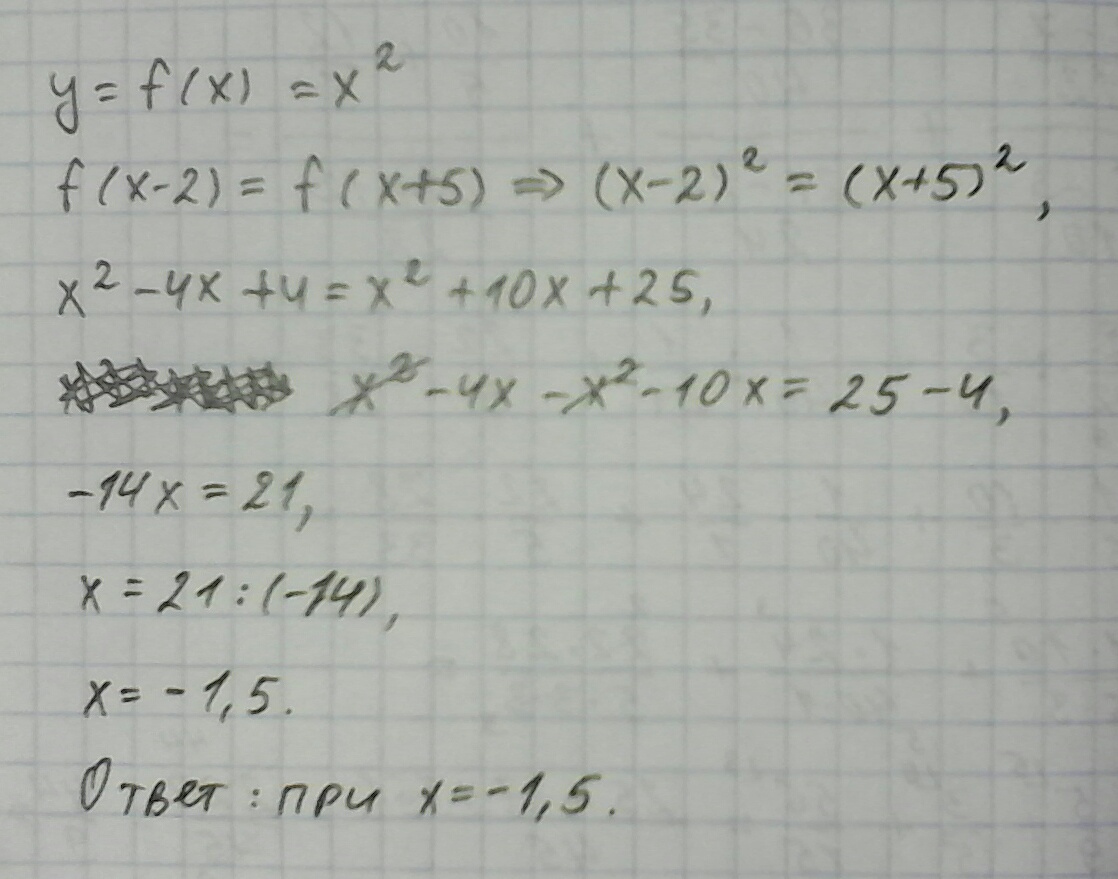 дана функция Y=f(X) где f(X)=х в квадрате. при каких значениях аргумента верно равенство f(X-2)=f(х+5)?