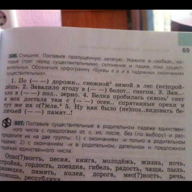 по (дат. падеж, 1 склон) дорожке снежной зимой в лес не пройдешь. Завалило ягоду в ( пред. падеж, 2 склон.) болоте снегом. Занесло в ( вин. падеж, 2 склон.) поле зерно. Белка пробилась сквозь снег в мох, достала там с (род. падеж, 3 склон) осени спрятанные орехи и тут же их съела. Ну как было не позавидовать беличьей (дател. падеж, 3 склон) памяти.