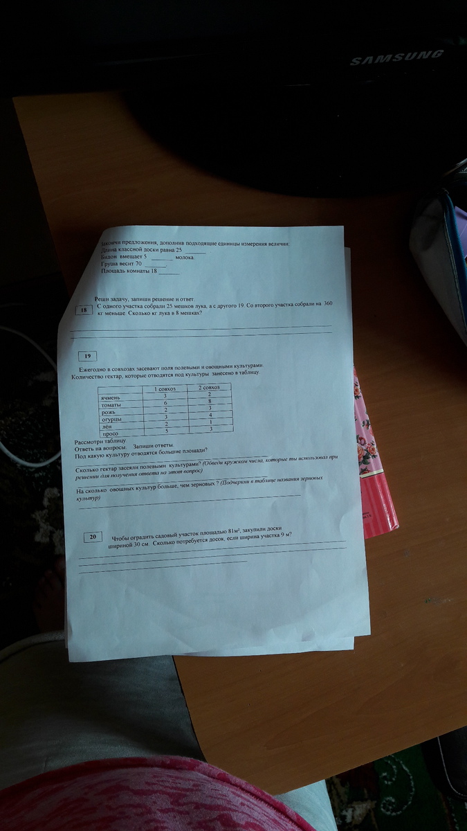 17. Дм, литр, г, м². 18. 1) 25 - 19 = 6 (мешков) разница; 2) 360 : 6 = 60 (кг) в одном мешке; 3) 60 * 8 = 480. Ответ: 480 кг . 19. 1) Под томаты; 2) 21 Га (обводишь все числа в строках "лён", "просо", "рожь", "ячмень"); 3) на 2 (зерновые культуры - все те, что были указаны в пред.пункте). 20. 1) 81 : 9 = 9 (м) длина; 2) 30 см = 0,3 м; 3) 9 : 0,3 = 30 (досок) на одну границу; 4) 30 * 4 = 120. Ответ: 120 досок.