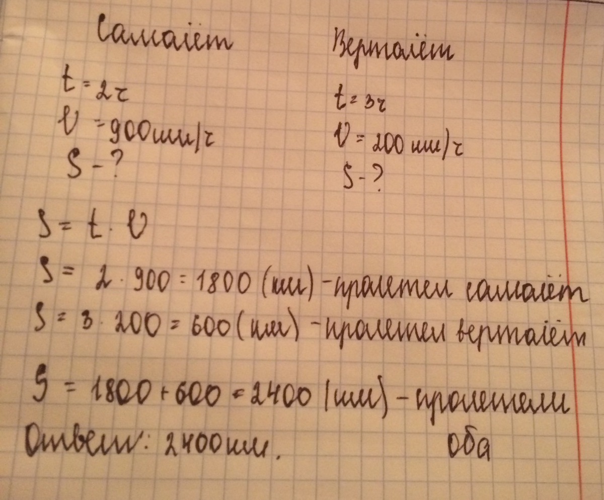 Самолёт летел 2ч со скоростью 900км в час,а вертолет 3ч со скоростью 200км в час.Какое растояние они преодолели вместе за это время
