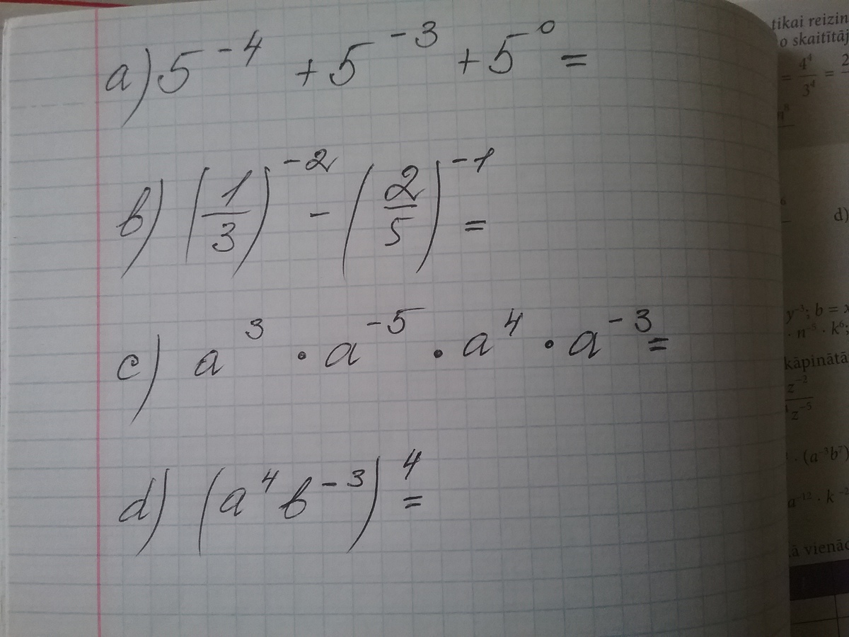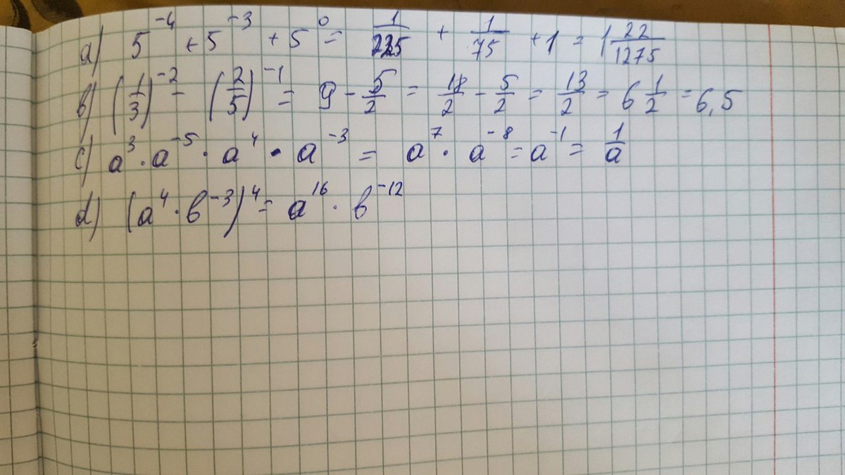 а) 5^(-4)+5^(-3)+5^0= 1/5^4+ 1/5^3+1=1/625+1/125+1=(1+5)/625 +1=