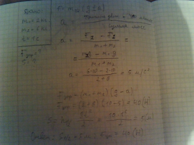 два шара связаны нитью , перекинутой через неподвижный блок. Массы шаров 2кг и 6кг. Определите силу упругости и путь, пройденный каждым телом за 1с