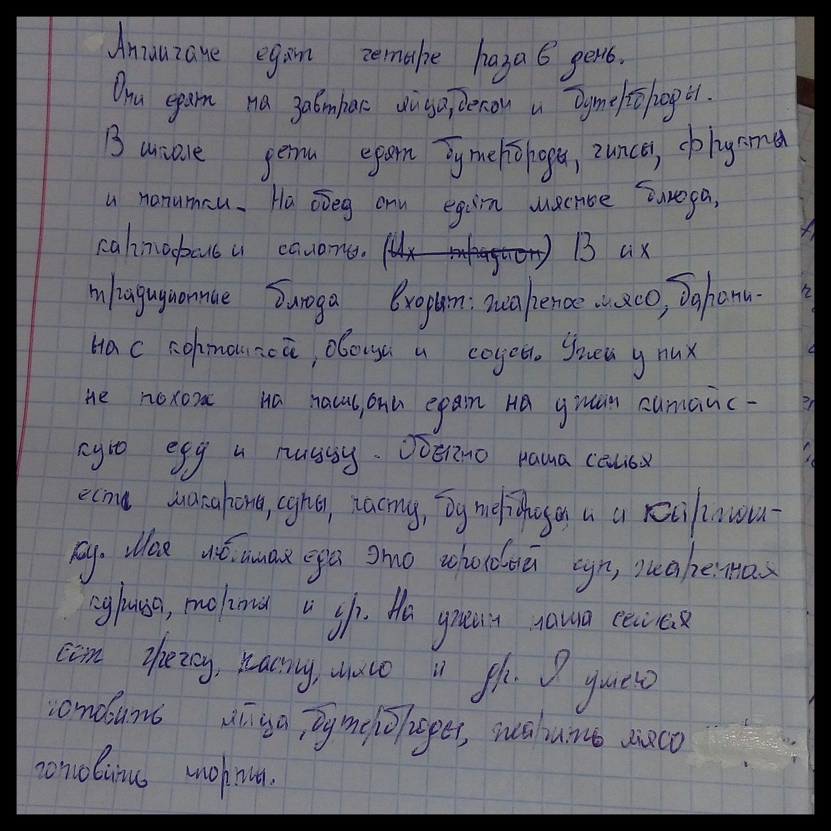 In school children eating sandwiches, chips,fruit and drinks. For lunch they eat meat dishes,potatoes and salads. Their traditional food includes:roast meat, lamb with potatoes, vegetables and sauces.Dinner they do not similar to ours, they eat for dinner, Chinese food and pizza. Usually our family pasta,soups,pastas, sandwiches and fries.My favorite food is pea soup, fried chicken,cakes, etc. For dinner, our family eats buckwheat,pasta. meat and etc. I know how to cook eggs, sandwiches,roasting meat and to cook cakes.