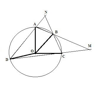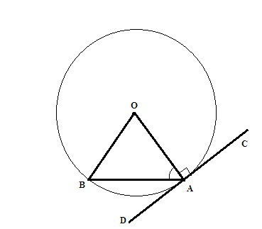 Угол OAC = OAD = 90° (касательная перпендикулярна к радиусу)