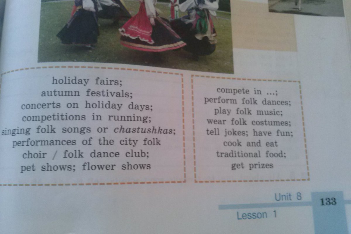 со второй рамки: исполняют народные танцы, играют народную музыку, носят народные костюмы, шутят, получать удовольствие, готовить и есть традиционные блюда, получать призы