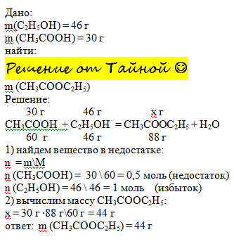 Какую массу этилового естера уксусной кислоты можно получить,при взаимодействии етановой кислоты массой 30 г и этанолу массой 46 г