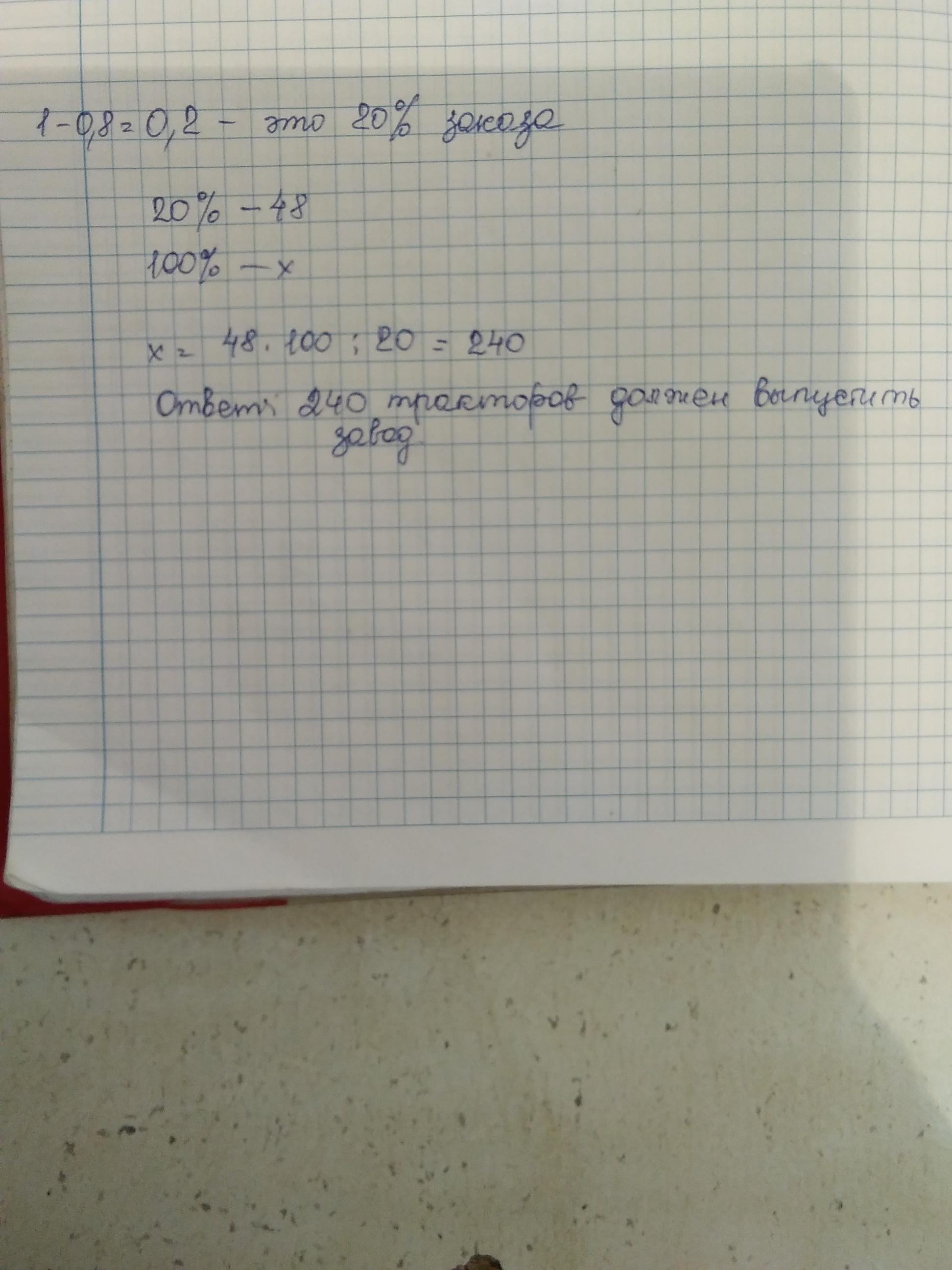 Тракторный завод выполнил 0,8 заказа.Чтобы полностью выполнить заказ,завод должен выпустить ещё 48 тракторов.Сколько тракторов должен выпустить завод для выполнения заказа?