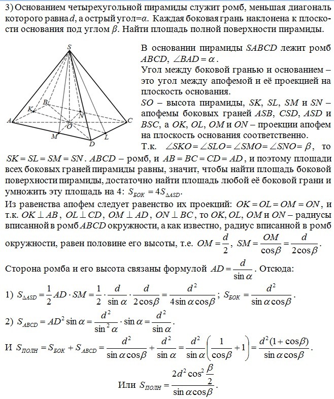 3) Основанием четырехугольной пирамиды служит ромб,меньшая диагональ которого равна d, а острый угол=альфа. каждая боковая грань наклонена к пло-ти основания под углом бэта. найти площадь полной поверхности пирамиды. Я начала рассуждать: Sполн=Sосн+Sбок.