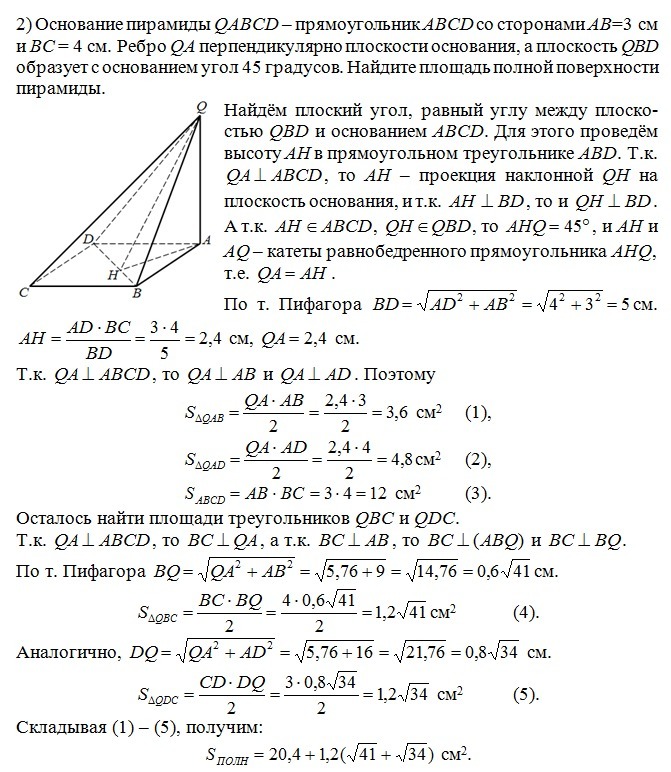 2) Основание пирамиды QABCD -прямоугольник ABCD со сторонами AB=3 см и BC = 4 см. Ребро QA перпендикулярно плоскости основания, а плоскость QBD образует с основанием угол 45 градусов. Найдите площадь полной поверхности пирамиды.