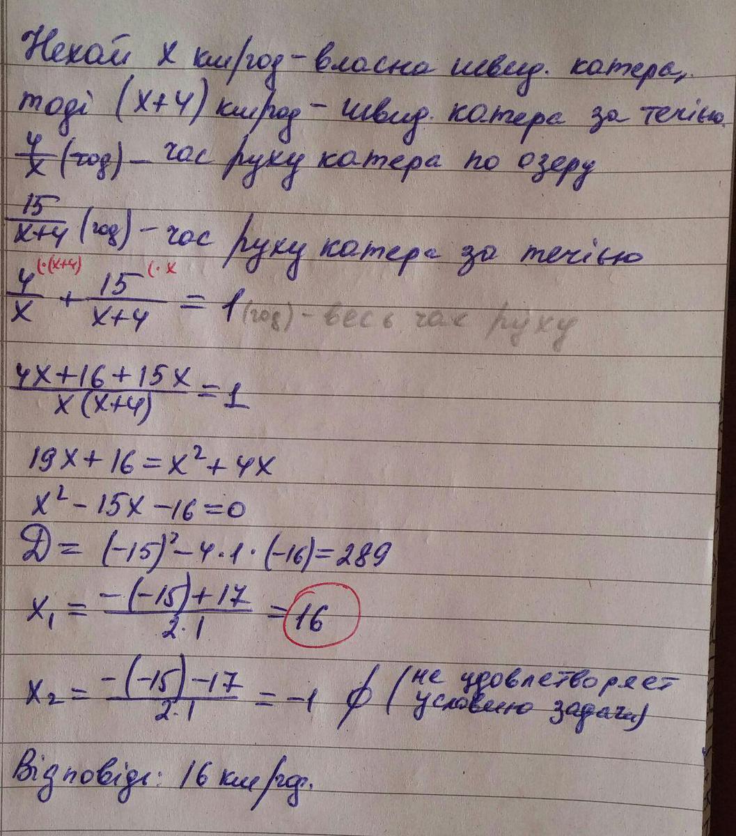 Катер пройшов 15 км за течією річки і 4км по озері витративши на весь шлях 1 год . Знайдіть власну швидкість катера якщо швидкість течії річки становить 4км/год