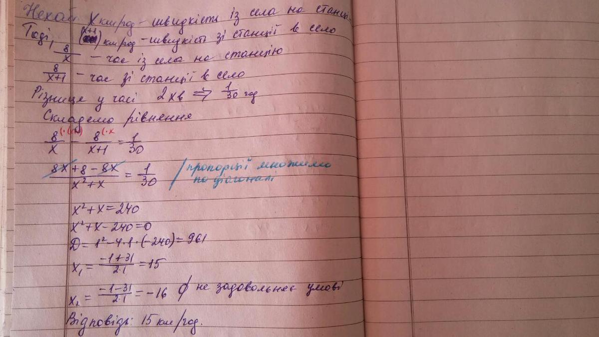 Велосипедистпроїхав із села на станцію і повернув назад. На зворотньому шляху він збільшив швидкість на 1км/год порівняно з рухом на станцію і витратив на нього на 2 хв менше. З якою швидкістюїхав велосипедист на станцію якщо відстань між селом до станції становить 8км