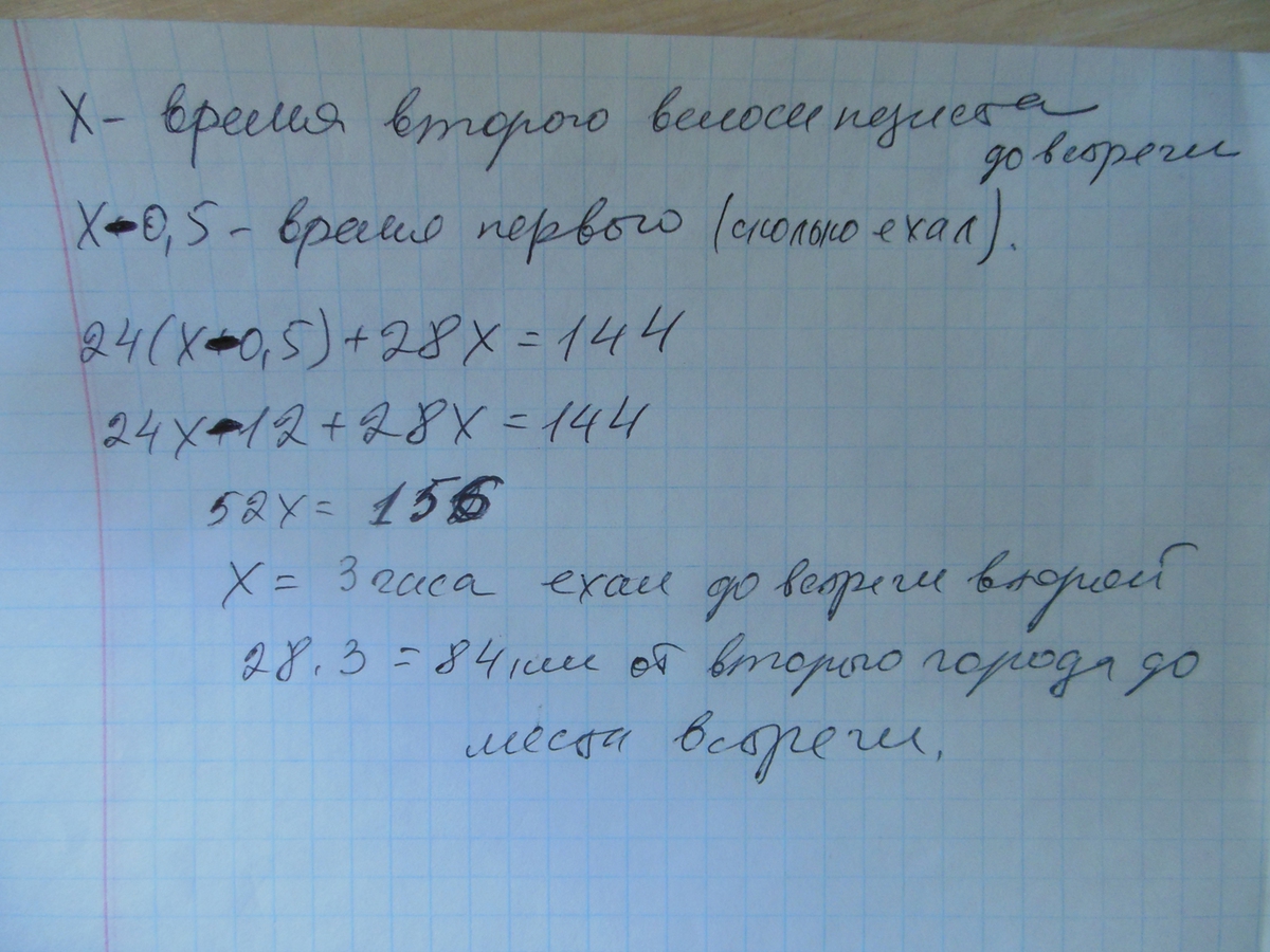 минут, а затем продолжил движение до встречи со вторым велосипедистом. Расстояние между городами составляет 144 км, скорость первого велосипедиста равна 24 км/ч, скорость второго — 28 км/ч. Определите расстояние от города, из которого выехал второй велосипедист, до места встречи.