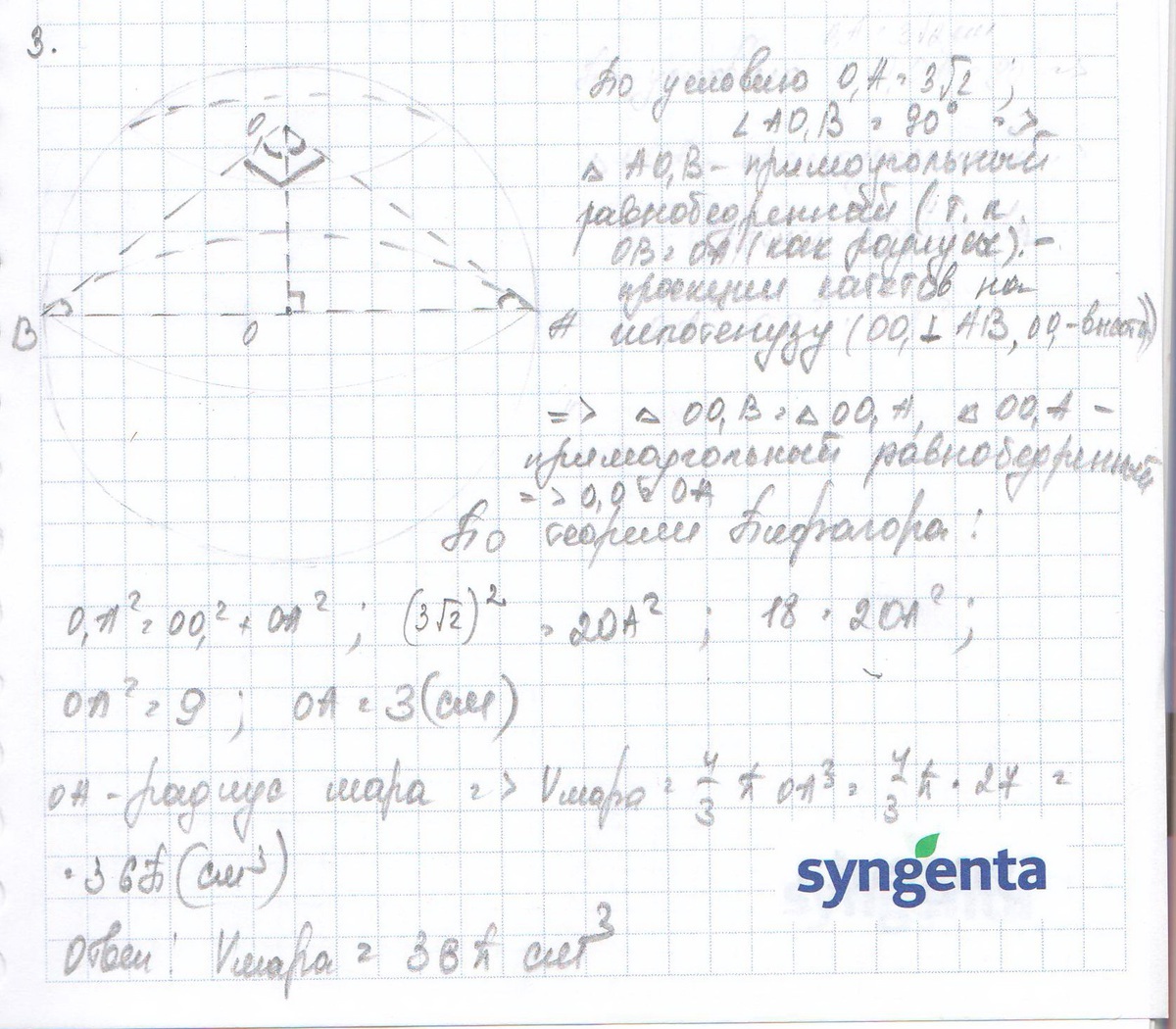 шар пересечен плоскостью . Длина отрезка , соединяющего центр сечения с точкой окружности большого круга шара , равен 3√2 см. вычислите объем шара , если длина диаметра большого круга видна из центра сечения под прямым углом.