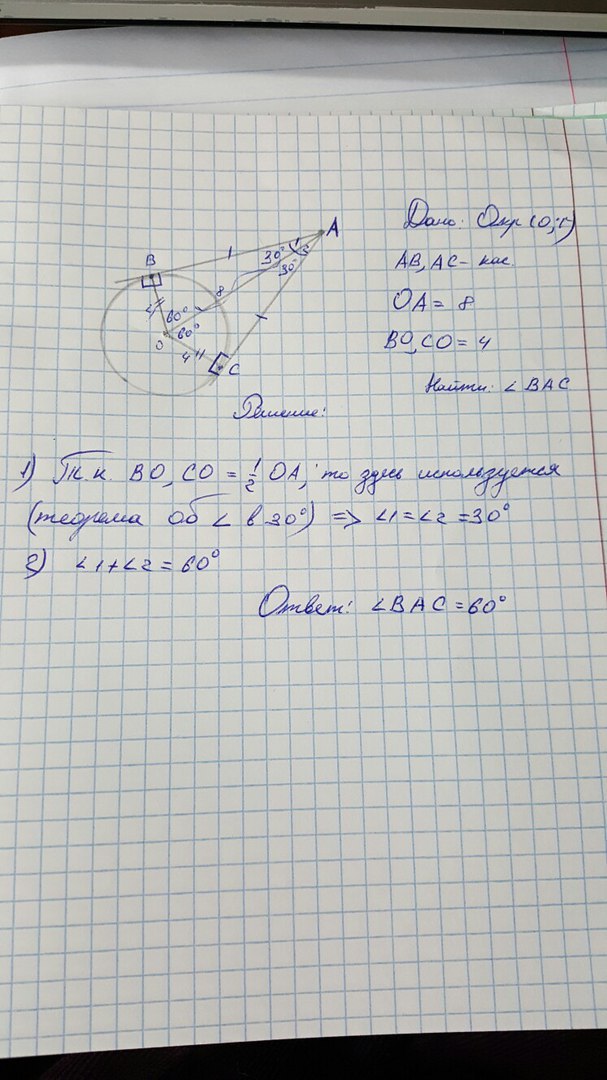 Из точки А проведены касательные АВ и АС к окружности с центром в точке О. Расстояние от центра окружности до точки А равно 8, радиус окружности равен