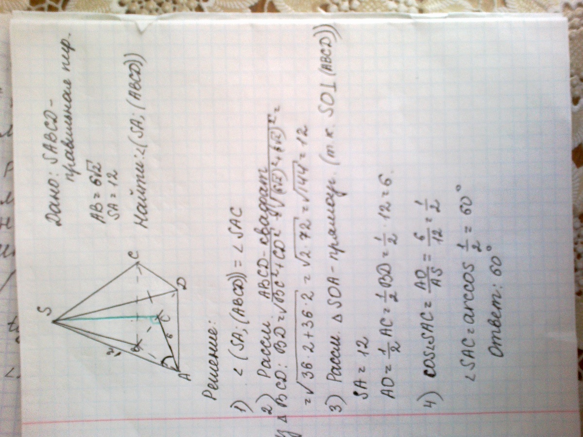 Сторона основания правильной четырехугольной пирамиды SABCD равна 6корней2. длина бокового ребра SA равна 12. Найдите градусную меру угла между боковым ребром SA и плоскостью основания пирамиды