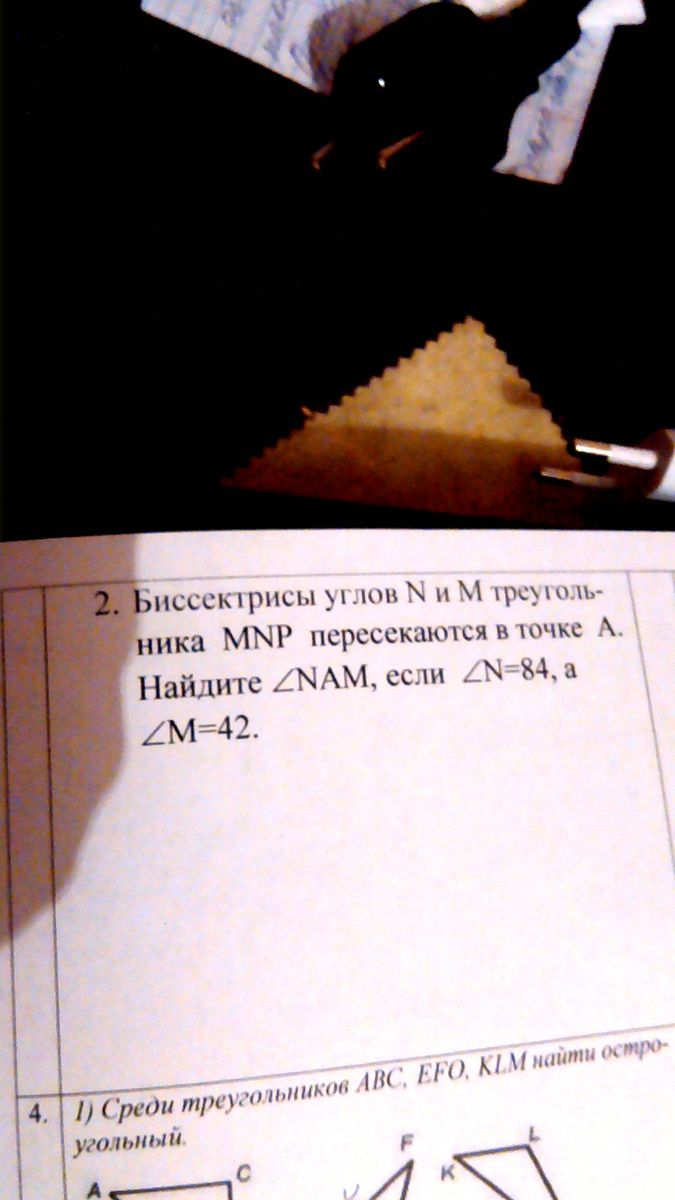 сумма всех углов любого треугольника=180град. Нам известны град. меры только двух углов N=84град. и уг.М=42град, Найдём угол А=180-(84+42)=180-126=54град