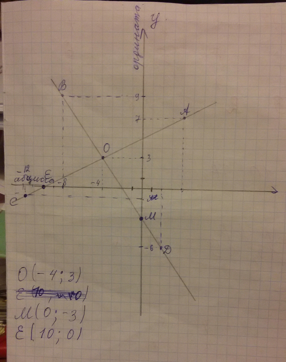 Отметьте в координатной плоскости точки А(4;7),В(-8;9),С(-12;-1) и Д(2;-6).Проведите прямые АС и ВD.Найдите координаты точки пересечения:а)прямых AC и BD;б)прямой АС с осью абцисс ;в)прямой ВD с осью ординат.