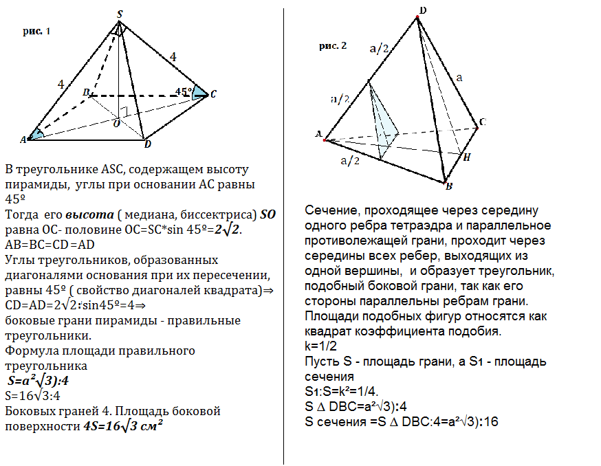 Тогда его медиана ( высота, биссектриса) SO равна ОС- половине ОС=SC:sin 45º=2√2.