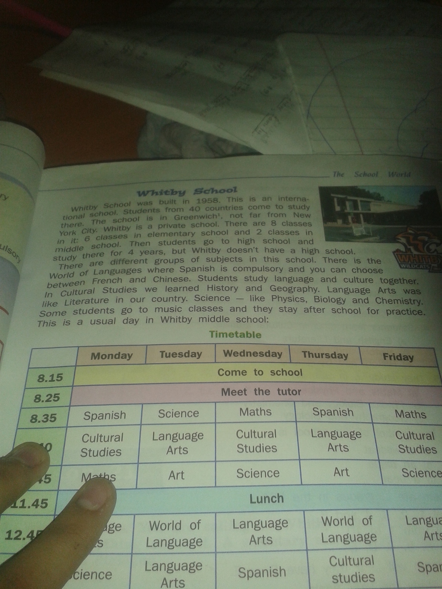 В этой школе есть различные группы предметов. Там Мир Языков, в котором Испанский является обязательным и вы можете выбрать между Французским и Китайским. Ученики вместе изучают язык и культуру, и в Культурологии мы изучали Историю и Географию. В нашей стране Словесность была похожа на Литературу. Наука - такие как Физика, Биология и Химия. Некоторые ученики посещают занятия музыкой и остаются после школы, чтобы попрактиковаться. А это обычный день в средней школе Уитби: (далее расписание)