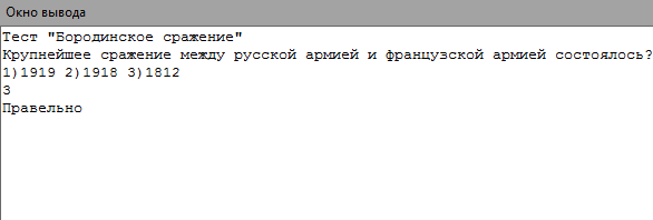 Написать программу проверки знаний битвы Бородино с вариантами 1919,1918,1812.