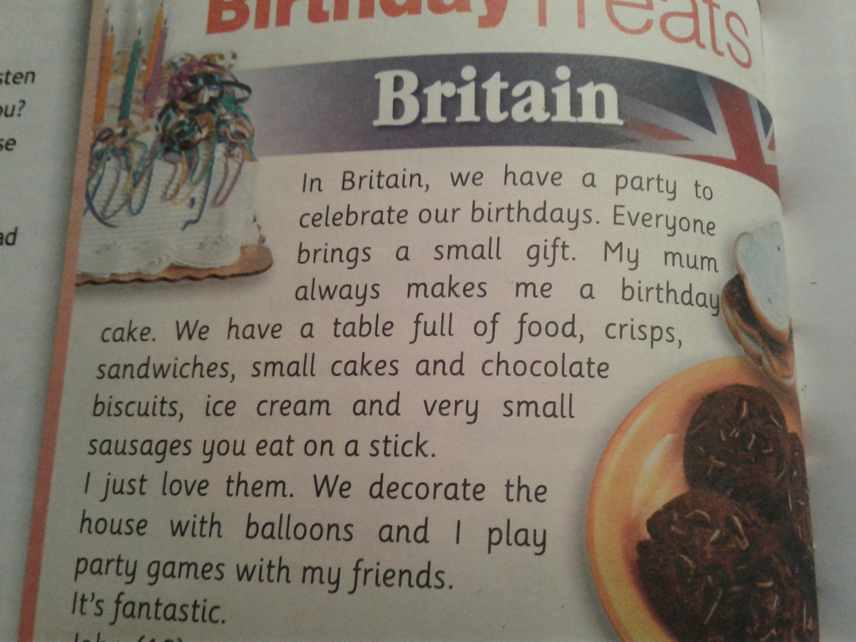 В Британии у нас есть вечеринка по случаю празднования нашего дня рождения. Каждый приносит маленький подарок. Моя мама всегда делает мне праздничный торт. У нас полный стол еды, чипсов, бутербродов, маленьких тортиков и шоколадных бисквитов, мороженного и очень маленьких сосисок, которые вы едите на палочках. Я просто люблю их. Мы украшаем дом шариками и играем в коллективные игры с моими друзьями. Это прекрасно.
