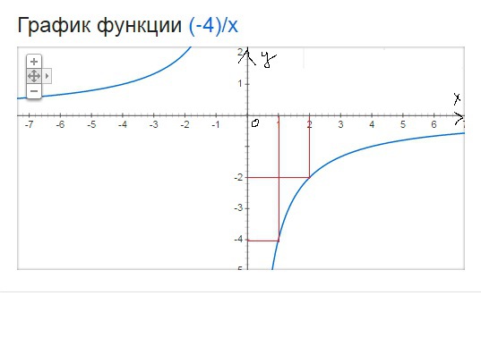 Начертите график функции y = - 4/x и укажите промежутки, где функция принимает : 1) положительные значения; 2) значения между -4 и -2