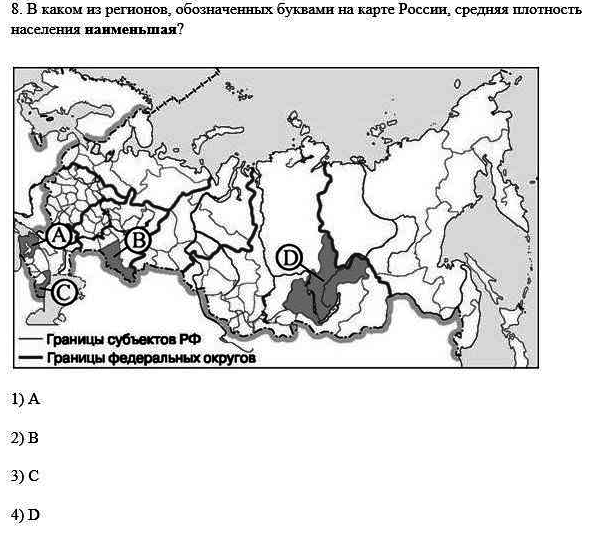 В каком из регионов,обозначенных буквами на карте России,средняя плотность населения наименьшая?География 8 класс задание тестовое во вложении
