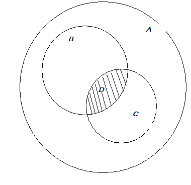 Множество В частично перекрывается множеством С, поскольку есть натуральные числа, которые делятся и на 4 и на 5. именно эта область составляет множество D (С=В).