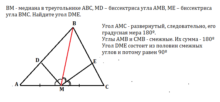 ВМ - медиана в треугольнике АВС, МD – биссектриса угла АМВ, МЕ – биссектриса угла ВМС. Найдите угол DME.