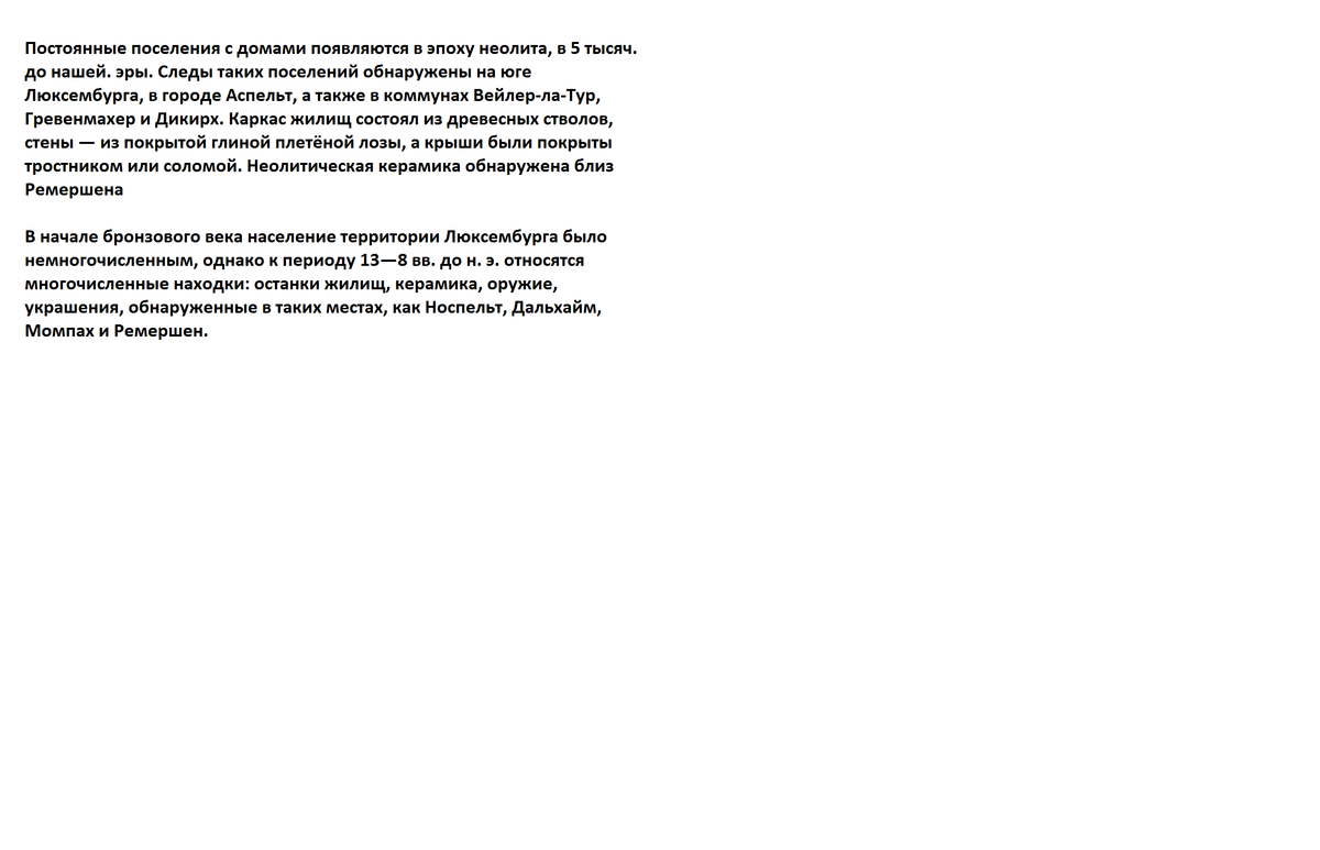 Древнейшие следы обитания людей на территории Люксембурга относятся к верхнему палеолиту и датируются около 35 000 годом до нашей эры. Древнейшие артефакты этого периода — украшенные кости, обнаруженные в Отрингене