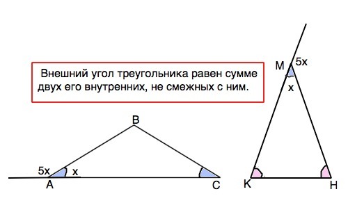 Сумма углов треугольника 180°. Внешний угол треугольника равен сумме двух других, не смежных с ним.