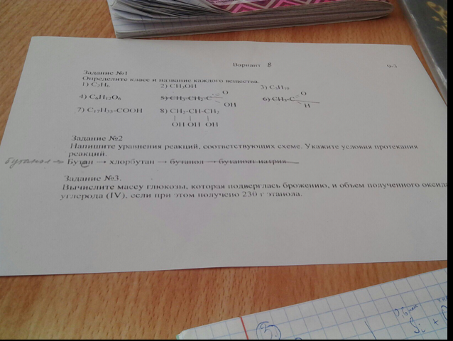 Задание #1. 1) класс: алканы,этан ; 2) предельные одноатомные спирты,метанол ; 3) это циклоалканы или непредельные алкены[оба варианта уместны так как структурная формула не приведена],циклопентан или пентен ; 4) моносахариды,глюкоза ; 5) карбоновые кислоты,пропионовая кислота ; 6) альдегиды,этаналь ; 7) непредельные,высшие карбоновые кислоты,олеиновая ; 8) многоатомные,предельные спирты,глицерин. Задания 2,3[см. приложенный файл]