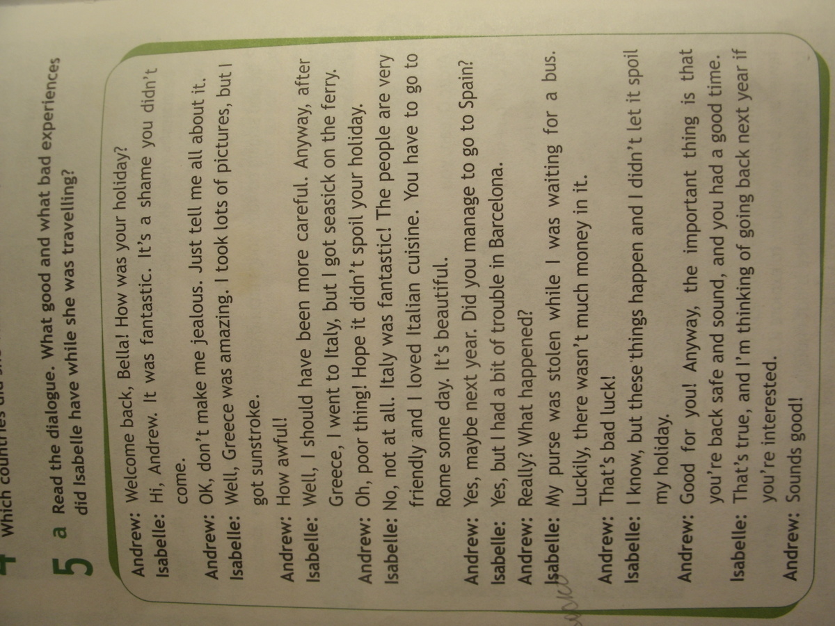 -Добро пожаловать домой, Бэлла! Как прошли каникулы?- Привет, Эндрю. Было замечательно. Жать, что ты не поехал.- Ладно, не заставляй меня завидовать. Просто расскажи все.- Ну, в Греции было отлично. Я сделала много фотографий, но получила солгнечный удар.-Какой ужас!-Ну, я должна была быть осторожнее. По-любому после Греции я поехала в Италию, но у меня была морская болезнь на лодке.-Ох, будная! Надеюсь, это не испортило твои каникулы.-Нет, нисколько! В Италии было фантастически. Люди очень дружелюбные и мне понравилась итальянская кухня. ты должен как-нибудь съездить в Рим. Он очень красив.-Да, возможно в следующем году. Вы успели съездить в Испанию?-Да, но у меня возникли небольшие проблемы в Барселоне.-Правда? Что случилось?-Украли мой кошелек, когда я сидела в автобусе. Хорошо, что там лежало немного денег.-Как неудачно!-Я знаю, но такое случается и я не дала этому разрушить мои каникулы.-Хоршо, по-люблму главное, что ты приехала здоровой и невредимой и ты провела хорошее время.-Это правда, я планирую поехать в следующем году, если тебе интересно.-Звучит неплохо!