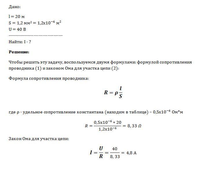 Определите силу тока на участке цепи, состоящей из константановой проволоки длиной 20 М, с сечением 1,2мм(2), если напряжение на концах этого участка 40 В
