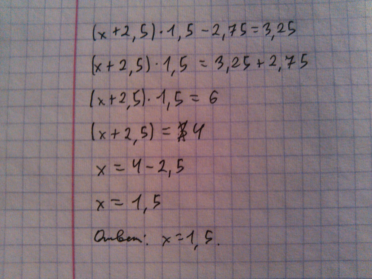 (x+2,5)•1,5-2,75=3,25 1,5х+3,75-2,75=3,25 1,5х=3,25-3,75+2,75 1,5х=2,25 х=1,5