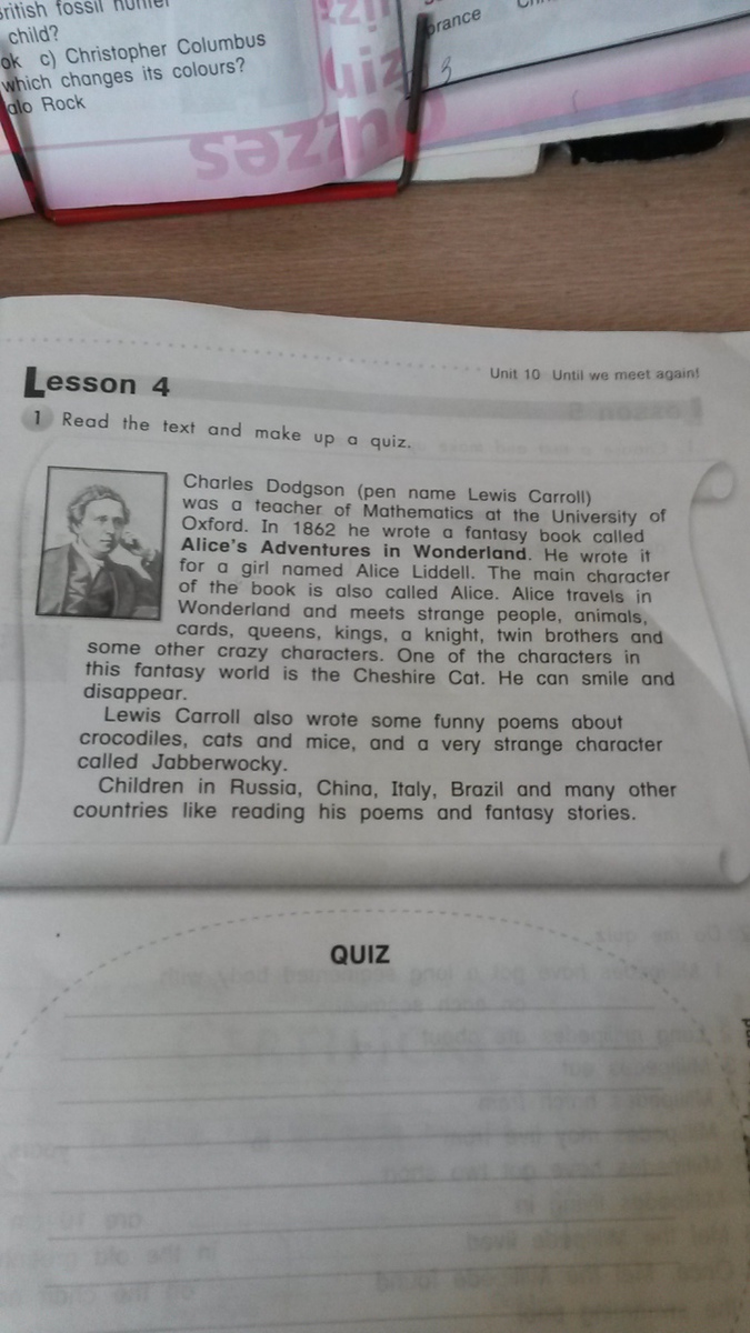 Чарльз Доджсон (псевдоним Льюис Кэрролл) был учителем математики в Оксфордском университете. В 1862 году он написал фантастическую книгу, именуемая "Алиса в стране чудес". Он написал ее для девочки, именуемая Алиса Лидделл. Главного персонажа книги также звали Алисой. Алиса путешествует по стране чудес и встречает странных людей, животных, карт (в данном контексте игральные карты), королев, королей, рыцаря, братьев близнецов и некоторых других сумасшедших персонажей. Один из персонажей в этом фантастическом мире - Чеширский кот. Он может улыбаться и исчезать.