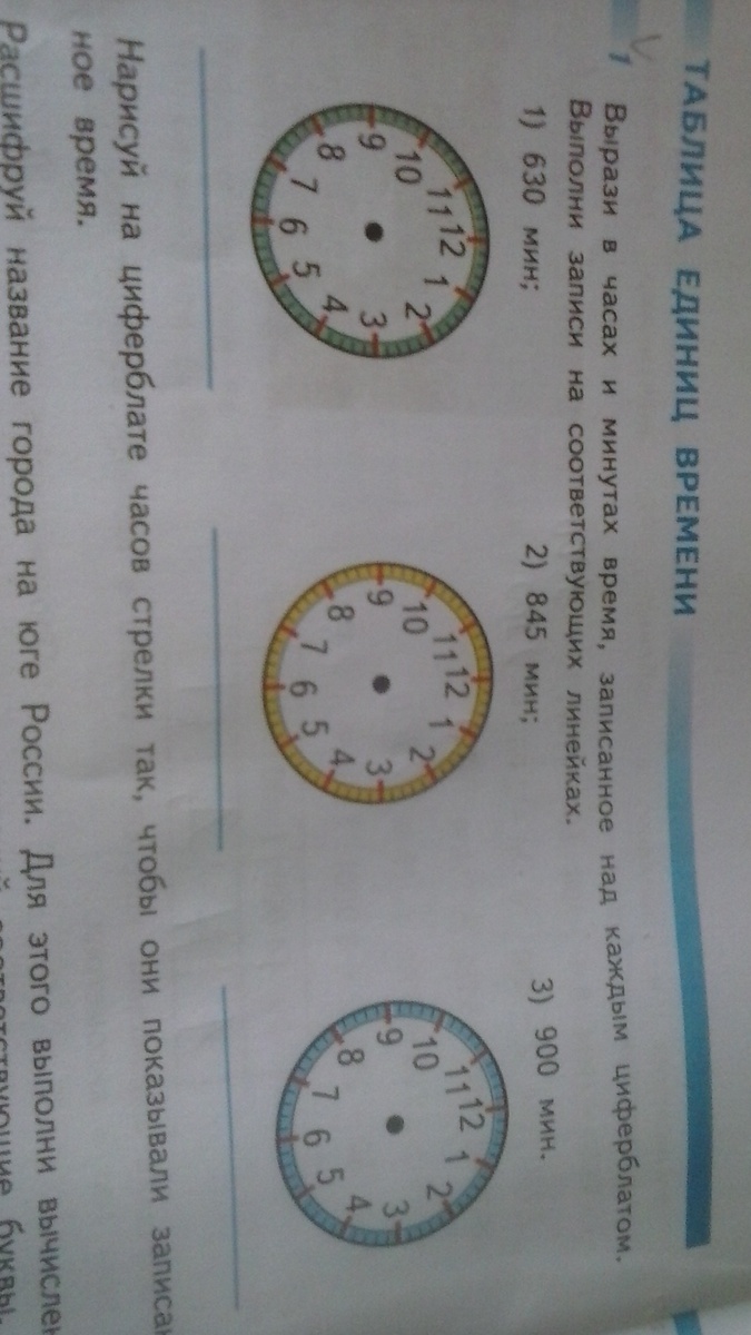 10часов и 30 мин большая на 30 минутах маленькая где-то 11 а второй 14 часов 5 мин то есть 14 - 12= 2 часа 5 мин маленькая стрелка на 2 а большая на 1 третий большая стрелка на 12 а маленькая на 3