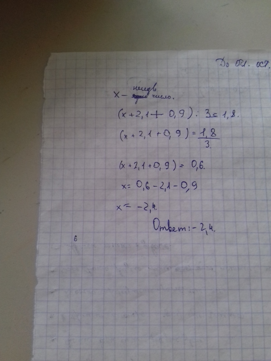 решите пожалуста. с объяснением:Среднее арифметическое трёх чисел равно 1,8. Найдите неизвестное число, если два других равны 2,1 и 0,9