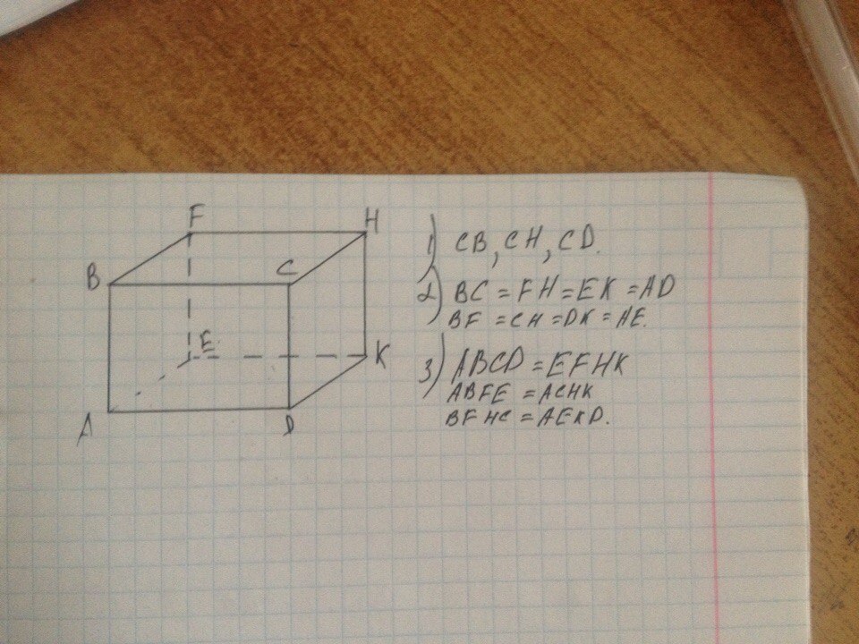Начертите параллелепипед AEKDBFHC.Выпишете: 1)ребра, выходящие из вершины C; 2) равные ребра; 3) равные грани ПРОШУ СОРЧНО НАДО