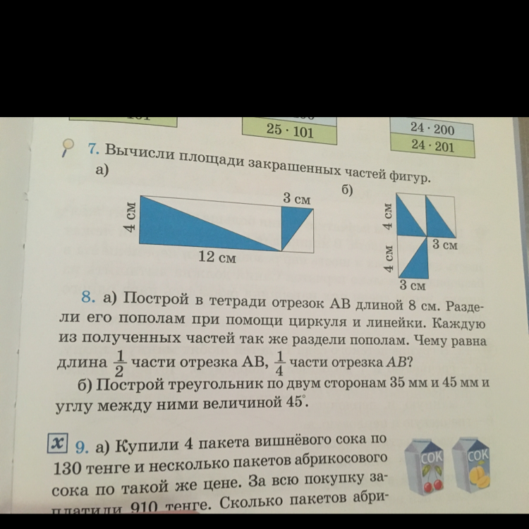 а )сначала,делишь отрезок на 2,получаешь два отрезка по 4см-это 1/2отрезка АВ,затем каждый из полученных отрезков делишь на 2 ,4:2=2 см- это 1/4 отрезка АВ.б)начертить не могу объясняю: на прямой отмеряешь 35мм- это одна сторона,берешь транспортир от начала отрезка отмеряешь угол 45°,по этому лучу отмеряешь длину 45мм соединяешь две полученные точки.