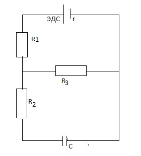 Конденсатор ёмкостью 2 мкФ присоединён к источнику постоянного тока с ЭДС 3,6 В и внутренним сопротивлением 1 Ом (см. рисунок справа). Сопротивления резисторов R1 = 4 Ом, R2 = 7 Ом, R3 = 3 Ом. Каков заряд снизуп в обкладке конденсатора?
