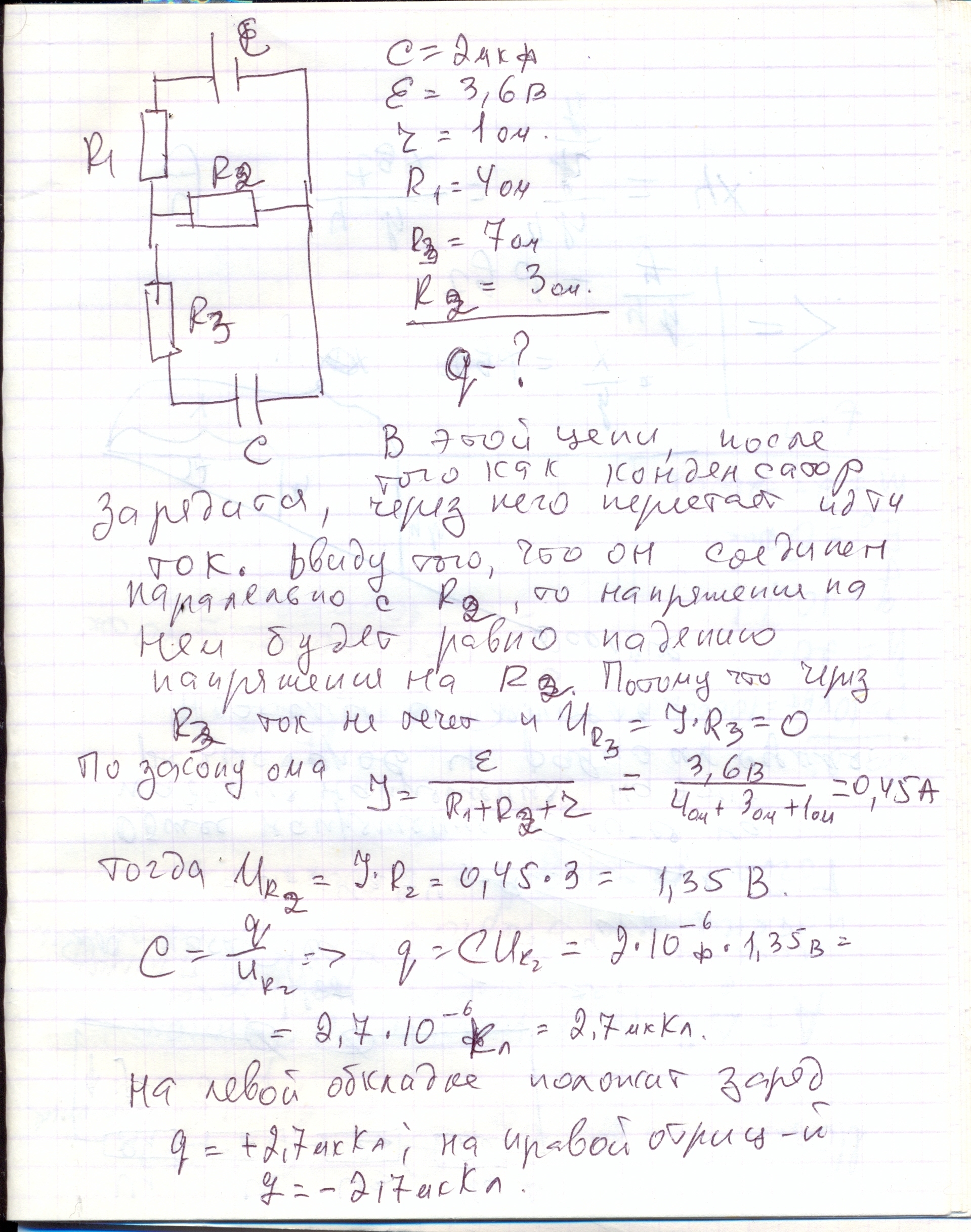 Конденсатор ёмкостью 2 мкФ присоединён к источнику постоянного тока с ЭДС 3,6 В и внутренним сопротивлением 1 Ом (см. рисунок справа). Сопротивления резисторов R1 = 4 Ом, R2 = 7 Ом, R3 = 3 Ом. Каков заряд снизу в обкладке конденсатора?